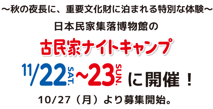 『古民家ナイトキャンプ』は、本事業で行う『~いのちかがやく温故知新の博覧会~古民家フェスティバル in 日本民家集落博物館』(https://kominka-fes.jp/)の一環として、11/22(土)から11/23(日)にかけて開催される、古民家に宿泊する体験イベントです。普段は宿泊できない重要有形民俗文化財『飛騨白川の民家』、重要文化財『日向椎葉の民家』において、屋内にテントを張った宿泊、囲炉裏を囲んでの食事という特別な体験をご用意します。