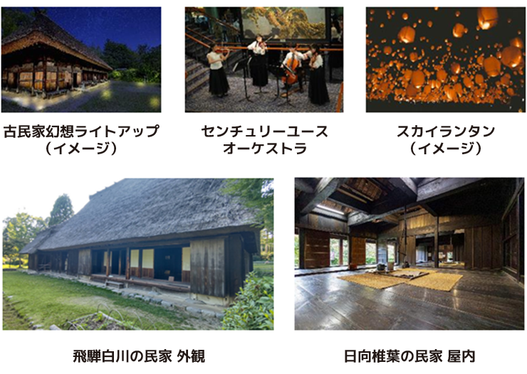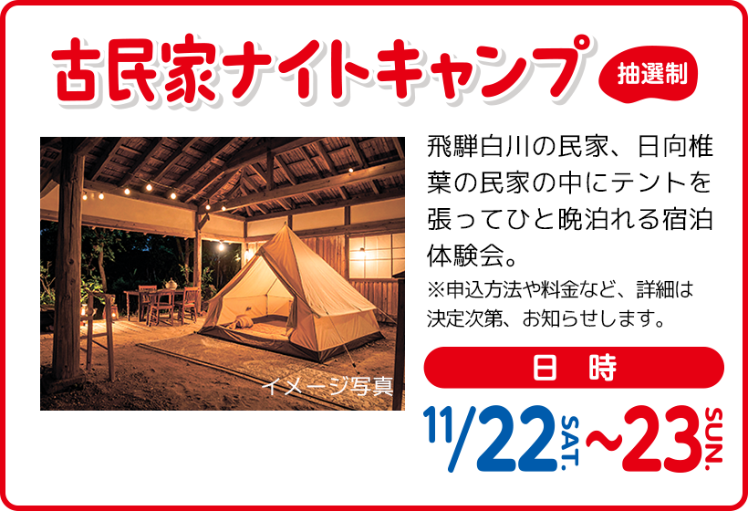『古民家ナイトキャンプ』は、本事業で行う『~いのちかがやく温故知新の博覧会~古民家フェスティバル in 日本民家集落博物館』(https://kominka-fes.jp/)の一環として、11/22(土)から11/23(日)にかけて開催される、古民家に宿泊する体験イベントです。普段は宿泊できない重要有形民俗文化財『飛騨白川の民家』、重要文化財『日向椎葉の民家』において、屋内にテントを張った宿泊、囲炉裏を囲んでの食事という特別な体験をご用意します。