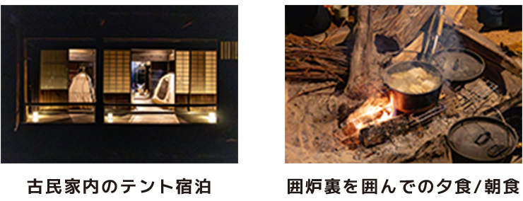 重要有形民俗文化財『飛騨白川の民家』、重要文化財『日向椎葉の民家』の建物内でテント宿泊。囲炉裏を囲んでの夕食/朝食もご用意。